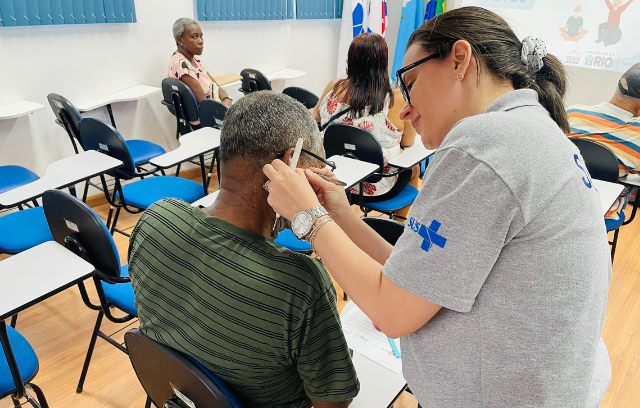 Durante a atividade, a nutricionista Flávia Seda realizou atendimentos de auriculoterapia, contribuindo para o cuidado integral e o bem-estar dos participantes.